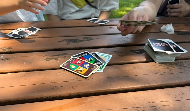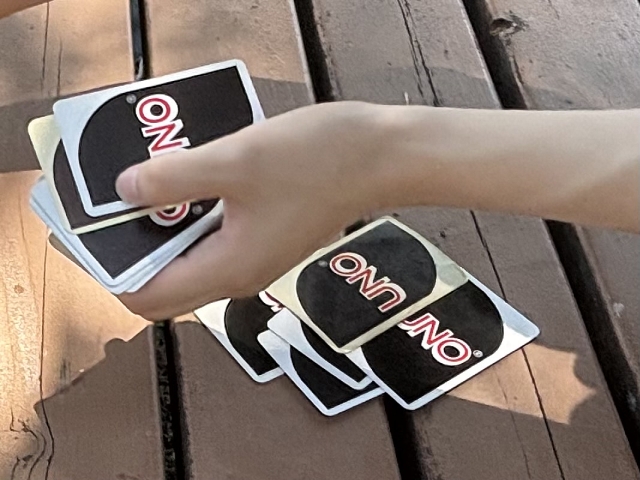 マユちゃん宅では「ドロー4返し」のローカルルールを採用しているため、UNOはここぞという時にリバースやスキップなどの技カードを使うと勝ちやすいゲーム。