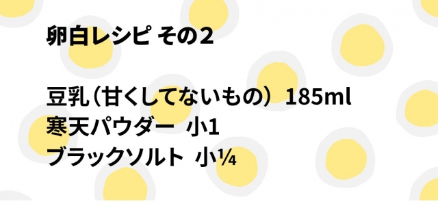 卵白レシピは、両方とも材料を全てミキサーにかけ、火にかけて沸騰してきたら型に流して固める、と言うシンプルなものだ。豆腐と豆乳の寒天ゼリーを作るような感じである。