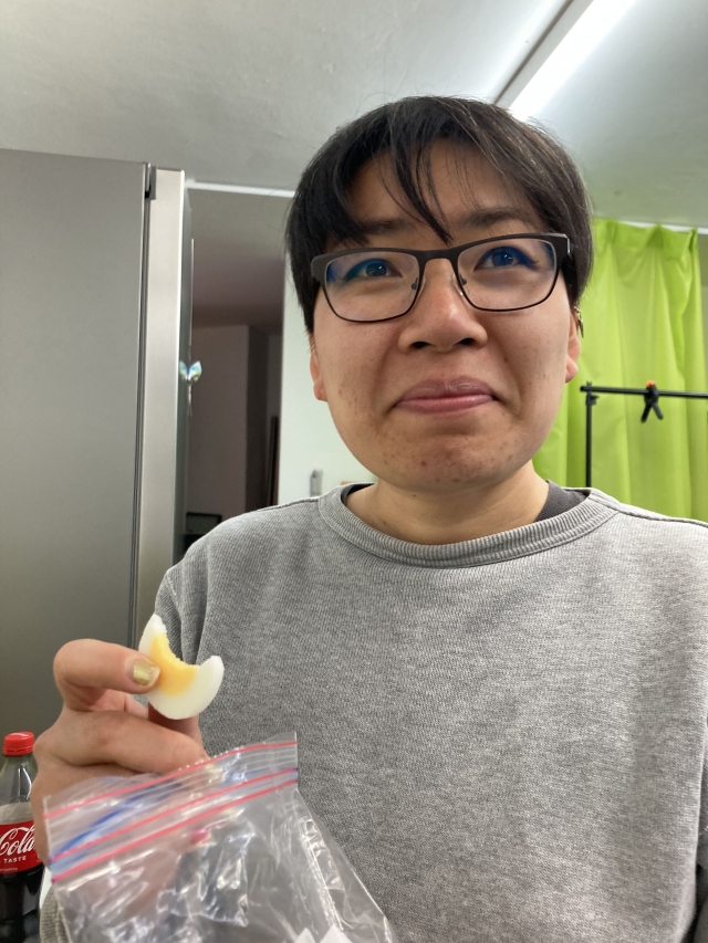匂いは間違いなくゆで卵なんだけど、味にはほんのり酸っぱさがある気もする。材料を確認すると、卵黄と卵白以外にもクエン酸とでん粉が加えられているらしい。