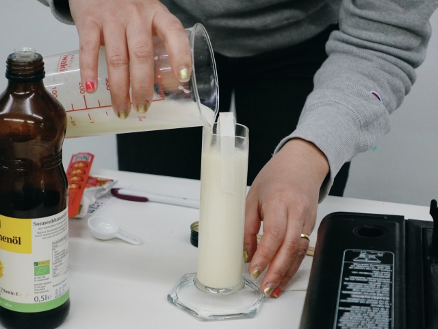 まず、後でたまごが出てきやすいようにビーカーに油をぬる。