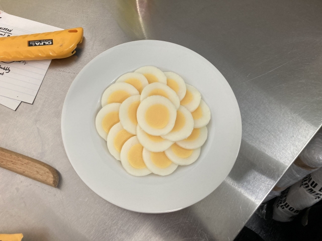 開発中のヴィーガン棒たまご。よく見ると練り物っぽさもあるが、パッと見たところではたまごにしか見えない。