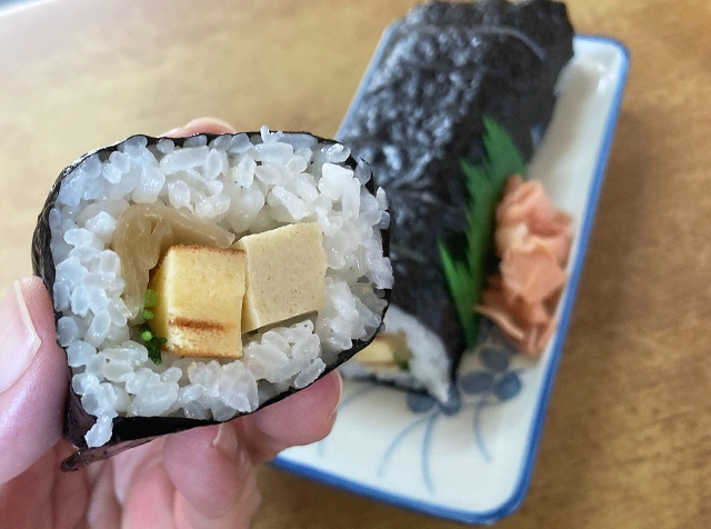 高野豆腐、玉子焼き、かんぴょうと青菜が具材の巻き寿司。しみじみと美味しい。