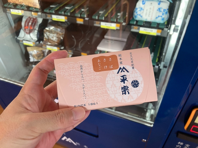 汗をかきながらさらに歩く。「笑屋」という無人休憩所があって、そこに入ったら、これもヨッピーさんがおすすめてしてくれていた「平宗」という老舗の柿の葉寿司の自販機があって、それは買うことができた。