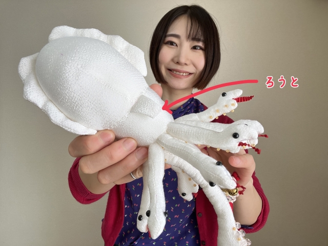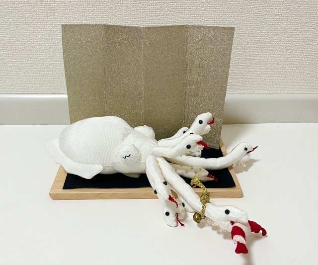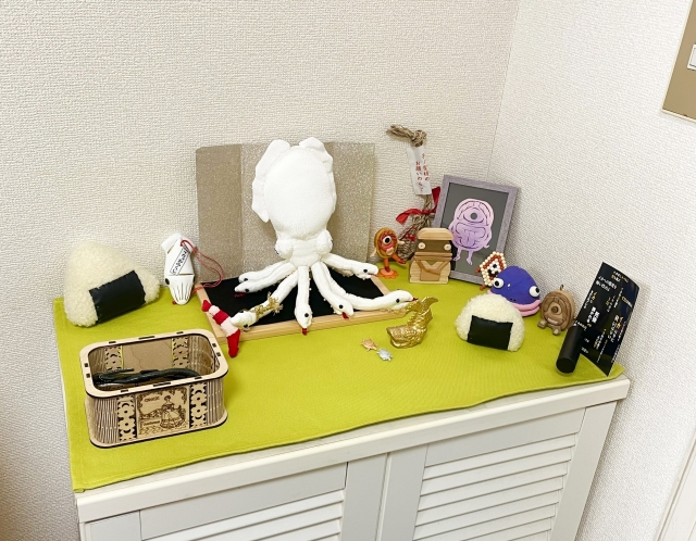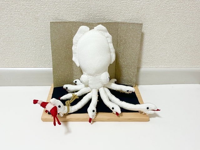 下に敷いている黒い布は、イカ墨をイメージしている。後ろにある金屏風は厚紙で作った。ありがたみが倍増だ!