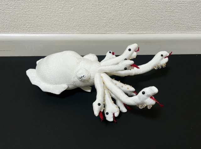 ちょうど家にあったギザギザのリボンで舌もつけた。立派なへびである。あとはイカと合体だ!