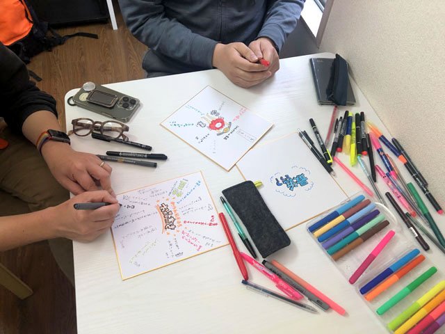 20分ほどでこれだけ出ている。僕一人では無理だっただろう。みんなで色紙を眺めつつしゃべりながら、という環境はアイデアをたくさん出すのには良いかもしれない。