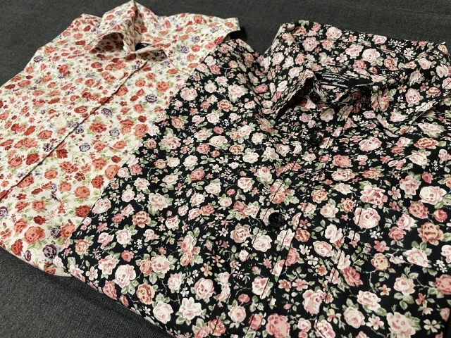 花柄がよく見るとドクロのシャツ、色違い2着です。初めて着た時、「あらかわいい」と寄ってきた母が、実はドクロと聞いた途端に去っていきました。