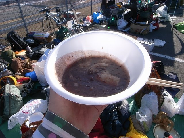 本当に楽しむべくはレース中よりもむしろ休憩時間の自炊にある(もちろん本気のチームは走りに集中していますよ、きっと)。我らがチームもこの自炊のレベルが年々上がってきていて、今年は煮込みハンバーグから始まり、から揚げ、おしるこ、うまい肉の煮込みなどなど、7時間以上にわたるレース中、常にうまいものが用意されていた。