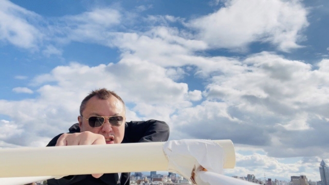 今まさにヘリコプターから垂らされた縄ばしごにつかまり大空高く飛び立とうとしているシーンである。