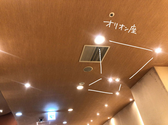 天井を見ていると、照明がオリオン座っぽく見えた。