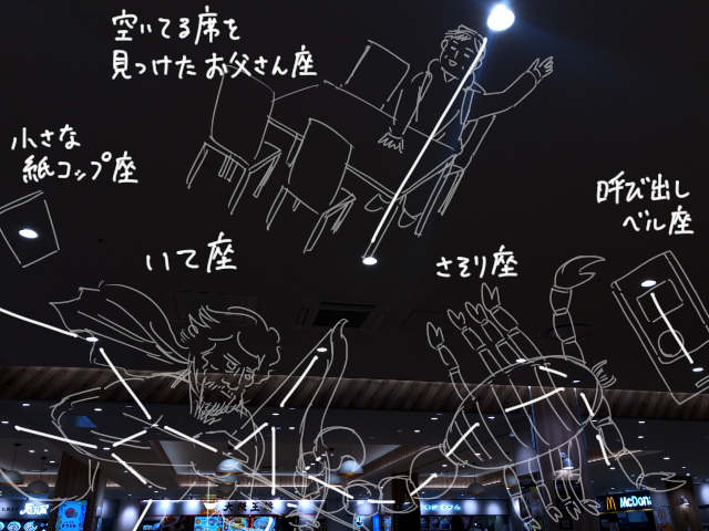 ファミレスやフードコートの星座は動かないし見る角度次第なので、方角も季節も分からない。物語も勝手に作るしかない。