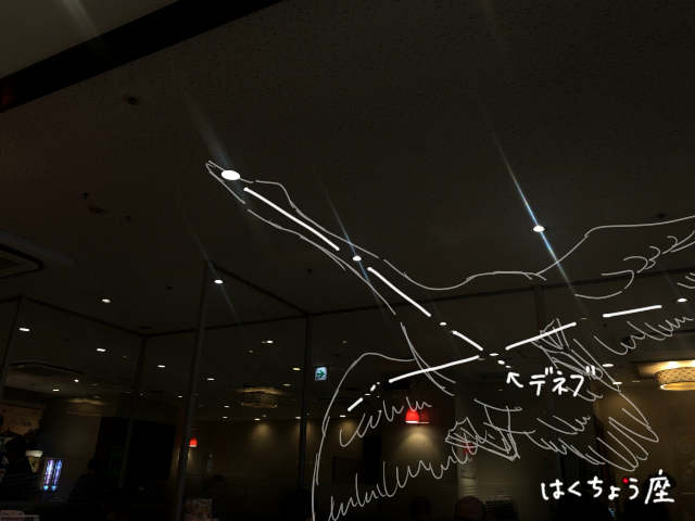 はくちょう座が定まったことで、奥の壁際の照明がデネブということになった。直径が太陽の100倍以上もある白色超巨星と呼ばれる恒星、ということになる。大変だ。