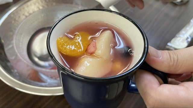 できあがったフルーツポンチをみんなでよそって食べる。同じ釜のポンチを食べた仲になろうじゃないか。