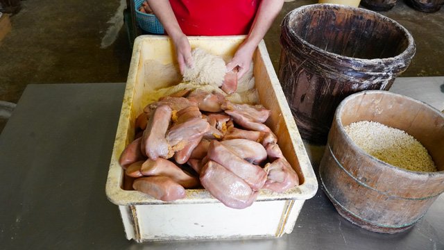 「そうですね。漁獲量が安定しておるし、春に取れたゴマフグは産卵期でいい卵を持ってるので。選定した魚から卵巣を取り出して約30%の塩水に1年間漬けます。この段階で漬け汁に毒が移行してかなり毒が抜けるけど、まだ出荷できるまでにはならないです」
