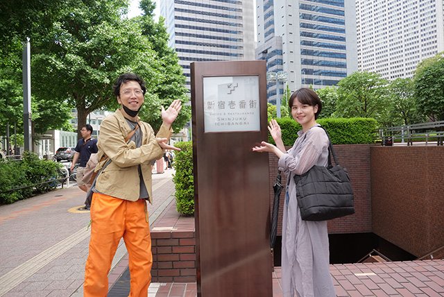 友達の舞台を見に来て一緒に写真に写る時のポーズをして、と言われデイリーポータル編集部の安藤さん(右)は「普通はこんな感じにやるかなー」と望月さんは「指が失礼に当たるんじゃないですか?」たしかに。