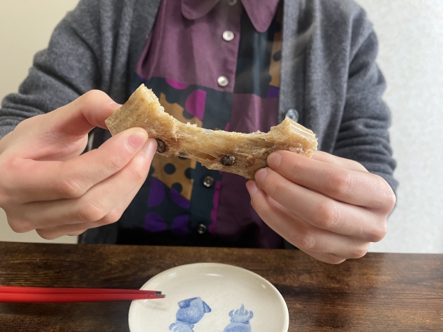 想像よりも伸びがある。 まずはそのままの味を知りたいので、何もつけずに食べてみよう!!