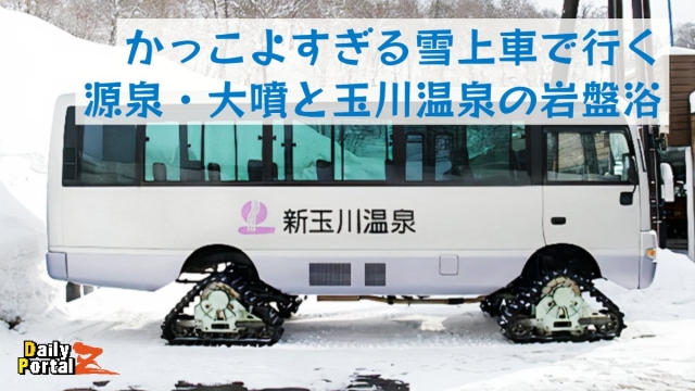 自宅を出発してから約7時間。長旅の末にようやくたどり着いたのは、玉川温泉の姉妹宿である新玉川温泉。路線バスはここが終着駅のため、ここからさらに先にある玉川温泉に向かう移動手段として、ようやく憧れの雪上車が登場するのだ。