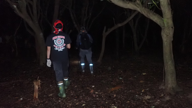 腹ごしらえが済むと日はすっかり暮れて周囲はただただ闇。無人島は無灯島なんですね、とか言いながらハブ探索がはじまる。