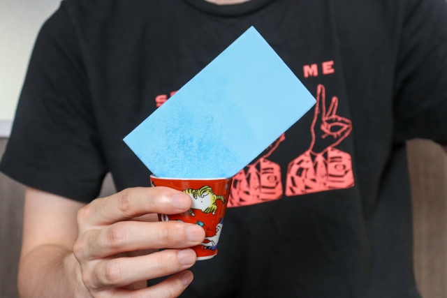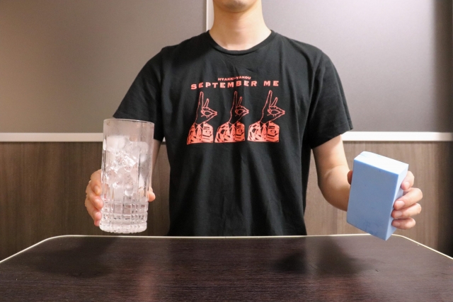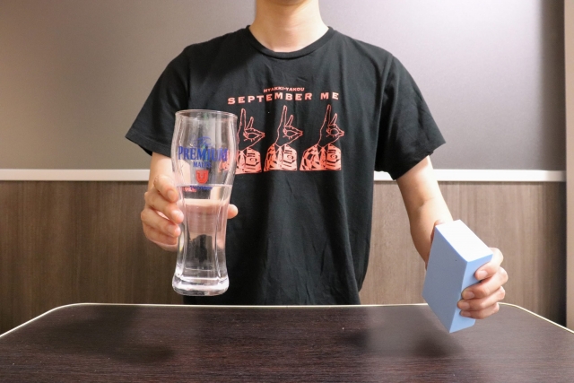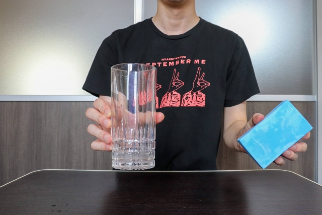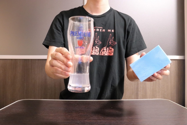 ものの数秒でグラスに残っていた水が消失した。すごい、吸水スポンジってこんなにしっかり吸水できるんだ。マジックのタネを見ているようだ。