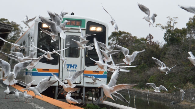 娘さんが営んでいる駅併設の喫茶店で余ったパンをユリカモメに与えたことがきっかけで、パンを与えているうちに人もユリカモメも増えたそうだ。