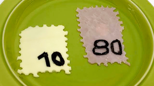 なお、これはハムでも同じようなことができます。さらに、海苔でもって額面の数字を作れば……もう、誰がどう言おうが切手です。