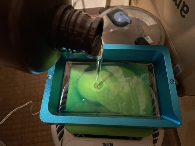 イソプロパノールで余分なレジンを洗浄。一次洗浄とすすぎ洗浄の2回。レジンに触る時は必ずゴム手袋をします。素手で触り続けるとレジンアレルギーになってしまうことがあります。