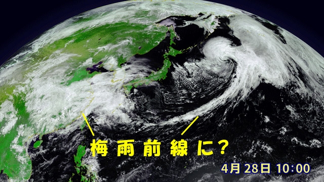 連休が終わる頃から、梅雨前線は沖縄をウロチョロと。そのまま動きがにぶくなって停滞すると、沖縄は梅雨入りとなる。(=沖縄に雨雲が集まるので、本州付近は晴れやすくなる)