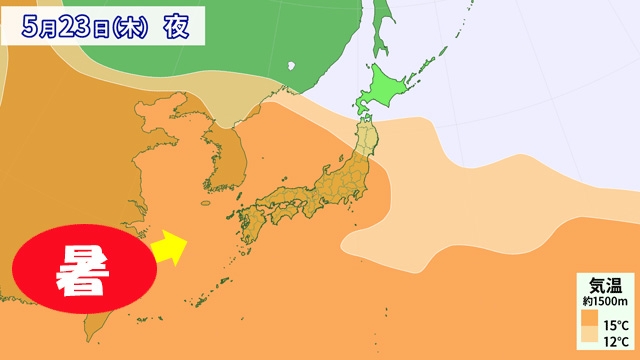 九州~本州でも、30℃くらいの暑さになる可能性はじゅうぶんにあり。あとは、ちゃんと晴れるかどうか。