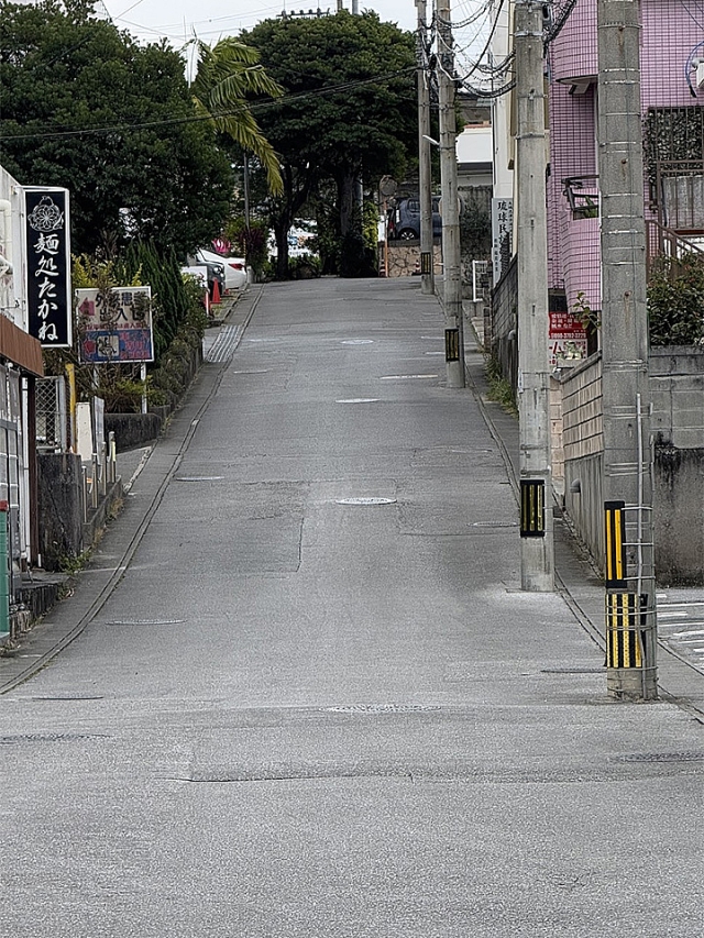 自転車を借りて住宅街を走ってみたが、沖縄の高低差の激しさに気づく。DEEの本田さんは「だから自転車に乗る人が少ない」と言っていた。確かに電動自転車じゃないと辛い。