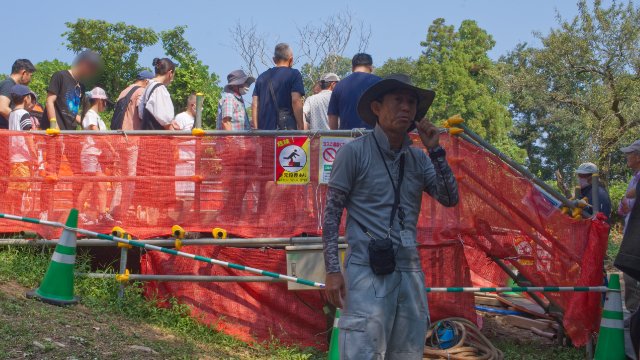 1号塔へ続く人の数はざっと100名ほど。「25名ずつ説明を行ないますので、並んでお待ちください」と市教委文化財課の職員さんがマイク越しに呼びかけている。