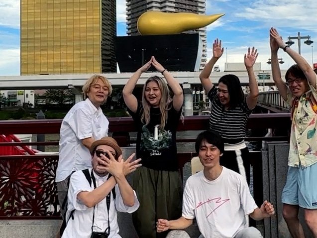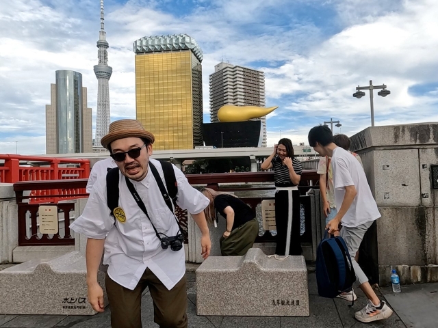 はしゃぎ観光、最後は吾妻橋のふもとで行うことにした。有名なアサヒビールのビルとスカイツリーをバックにはしゃぎフィナーレだ。