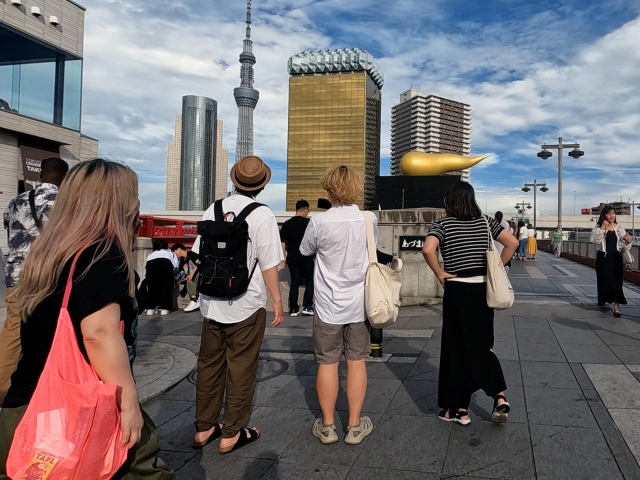 全員がうしろのアサヒビールのビルのかたちに引っ張られている。ビルの形をめいめいが口にしていた。