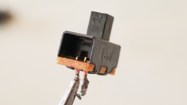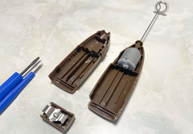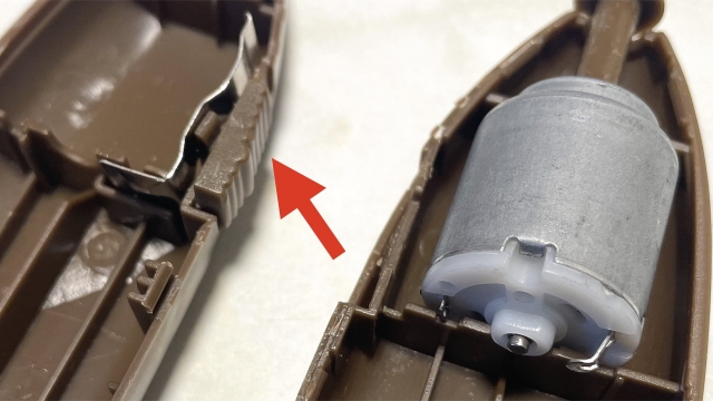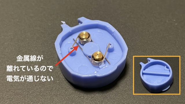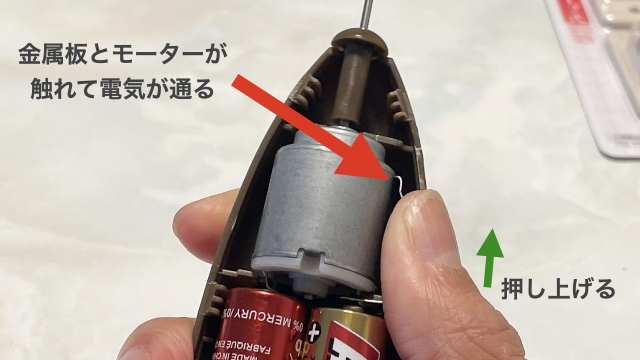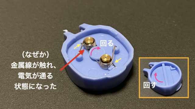 ところが完成かと思った矢先、突然ピクリとも動かなくなった。無理につなげた線が外れたのと、電池を固定するバネが不安定だったのが原因のようだ。