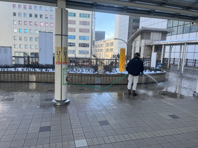 いつもハトがたくさん集まっている駅前のスポットに行ってみたら、おじさんたちが地面に水をまいていた。