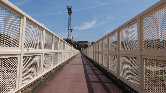 歩道橋は線路の上へと続き、長い橋(羽沢跨線人道橋)になっている。そこから車庫や貨物コンテナが見える。