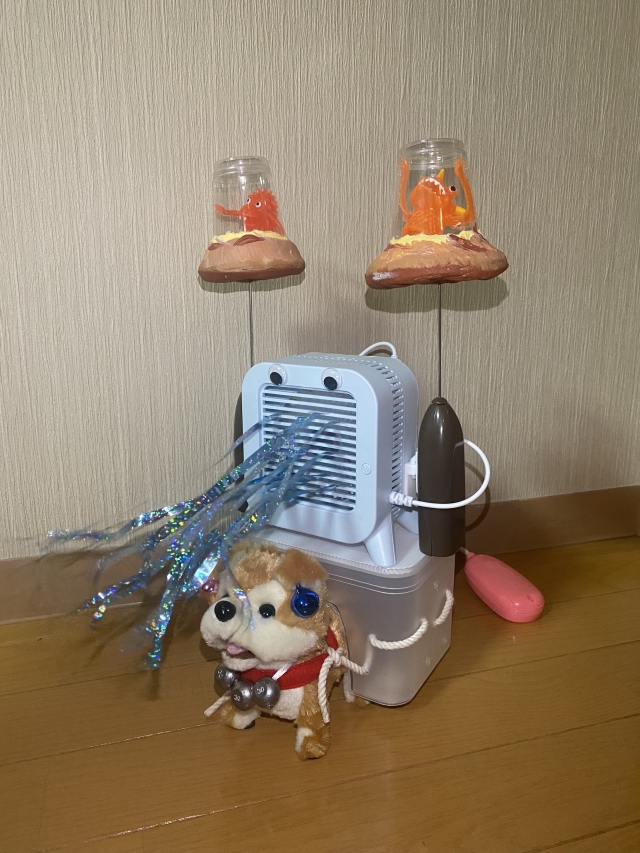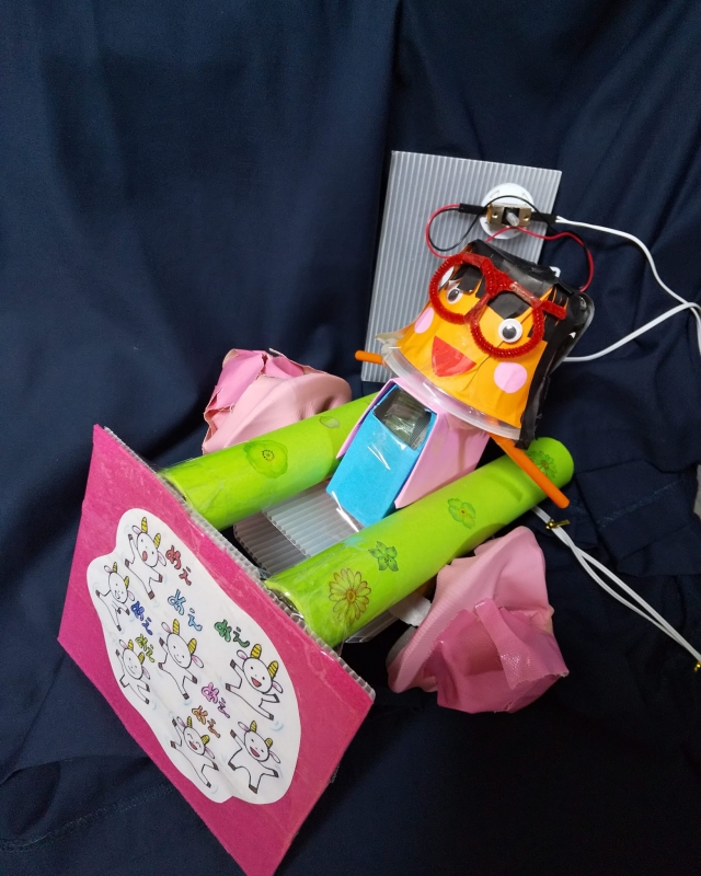 説明には「日用品を使った心温まるロボ”The日常”の散歩で、心を癒されながら戦いに挑む”シャコッチ”。」とある。唯一、ロボット同士の相関図までこまかく構想してくれたチームだが、主催者としては、そもそも出場機は1体までであることに注意してほしいなと思う。