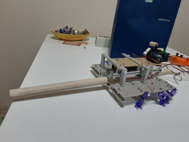 「棒使い多脚ロボ」とのことで、6足歩行ロボを二連装した12足ロボと思われる。多脚の数が思ったより多い!