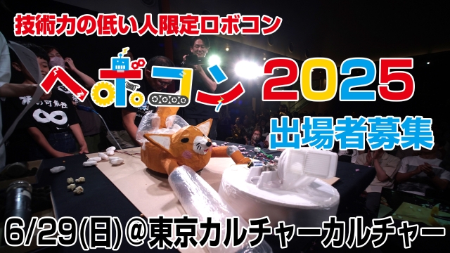ロボットなんて作れない人たちが、自作の「自称・ロボット」を持ち寄り無理やりロボットバトルをするイベント、「技術力の低い人限定ロボコン(通称:ヘボコン)」。