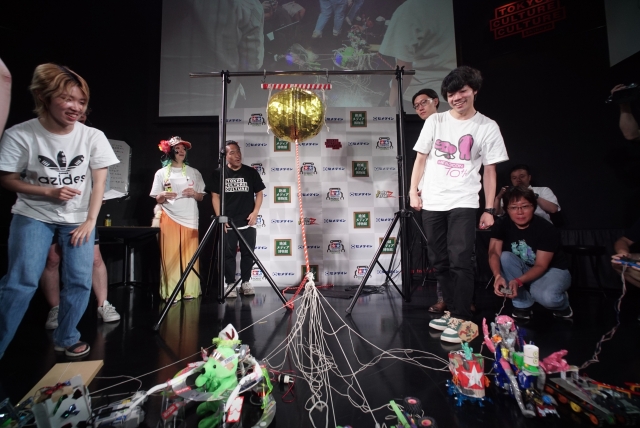 1回戦で敗退した全チームによる、くす玉割りだ。なにぶん初戦で押し負けたロボットばかりなので、その力は弱い。皆さんが想像している以上に弱い。でもさすがに10体以上集まれば……という淡い希望のもとに企画した。