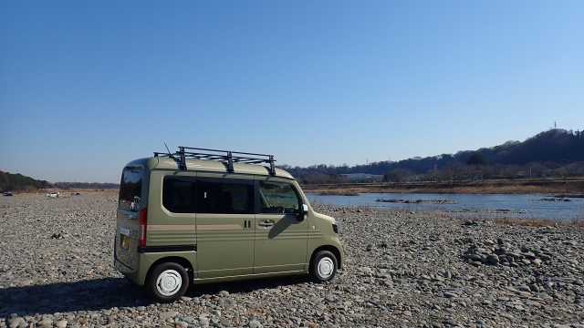 キャンプといえばいい景色の中での自炊である。今回もホンダアクセスからHonda純正アクセサリーを装着した『N-VAN』を貸してもらったのでオートキャンプのできる川原までやってきた。
