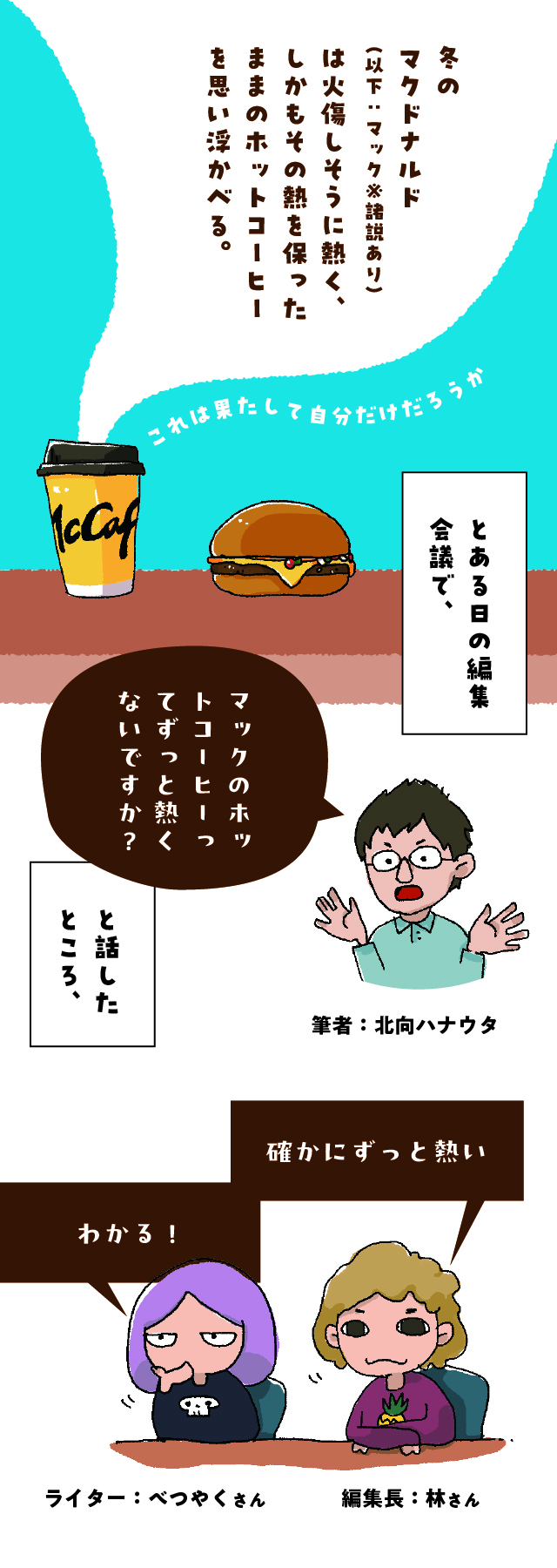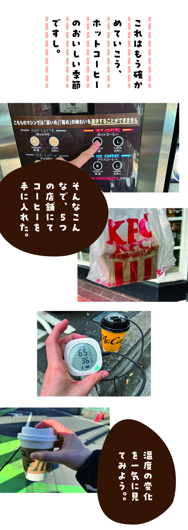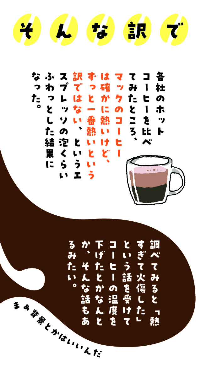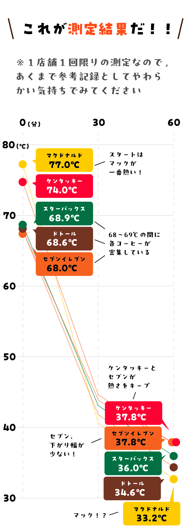 マクドナルドのホットコーヒーってずっと熱い気がする。そう思って他のホットコーヒーたちを集めて温度の変化を見ていったらいろいろ気づいたことがあった。