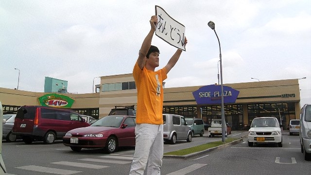 立つ場所は高台からも見つけやすいスーパーの駐車場。早起きして開店前に撮影を終わらせたかったのだが、結局起きれなくて昼になってしまった。自分の名前を掲げる白い男に買い物客も足を止める。