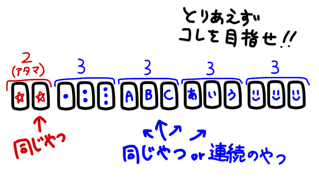牌には数字(1〜9)とか漢字とかいろいろ種類があって、この組み合わせが条件(3のとこが全部連続とか全部数字とか)を満たすと「役」が成立してどうやらなんか良いらしい。