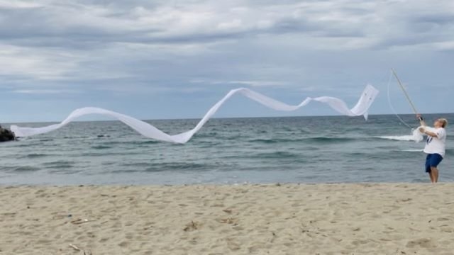 この日の海辺は風が強く、一反もめんは舞い上がるものの、長すぎて完全には宙を舞わない。