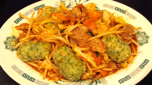 百合おんさんは、好きが高じてフレンドリーに「磯部」(磯野、野球いこうぜ! のイントネーション)と呼ぶほどの好物「ちくわの磯辺揚げ」をピリ辛な肉野菜炒め「バクダン炒め」とかけ合わせ。