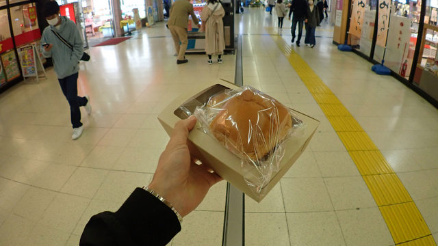 座っていただけなのにおなかが空くのには我ながら納得いかないけれど、こればかりは仕方がないので改札を出ていい匂いのする方向へ。お土産物屋さんの隣にパン屋があった。店員さんに聞くと、このあんぱんが一押しなのだとか。