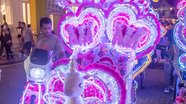 マラッカのトライショーはそれぞれアニメや映画などのキャラクターをモチーフとして花や人形で飾り付けられている。