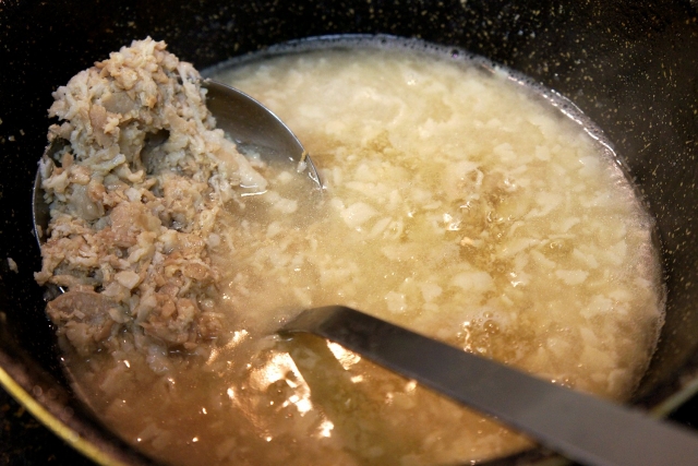 ここで先ほどのマッシャーがあればそれを使い、なければヘラとか、おたまの底などで根気よく肉を崩す作業をしてやれば、