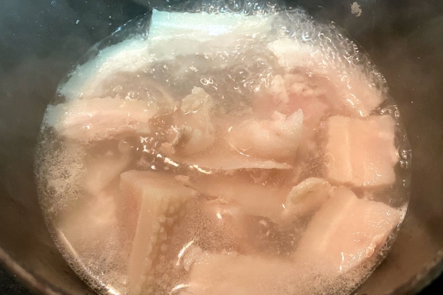 さっそく鍋にたっぷりの豚ばら薄切り肉を入れ、ねぎの青い部分としょうがひとかけ(あればでいいでしょう)を加え、ひたひたのお湯で煮込んでいきます。