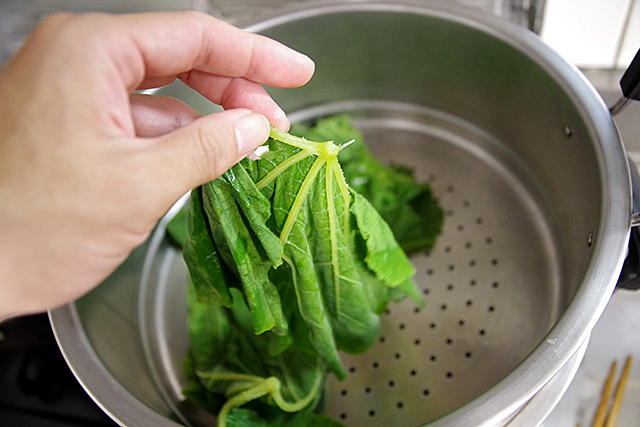 もちろんサンチェやエゴマのように生では食べられないので、蒸し器で5分ほど蒸してから、冷蔵庫にあった豚バラの角煮とキムチとご飯を巻いてみた。